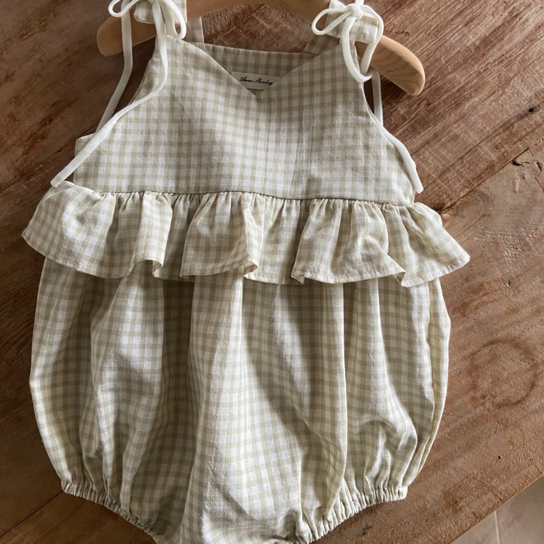 ナチュラルな色合いとシャーリングたっぷりのフリルが印象的です