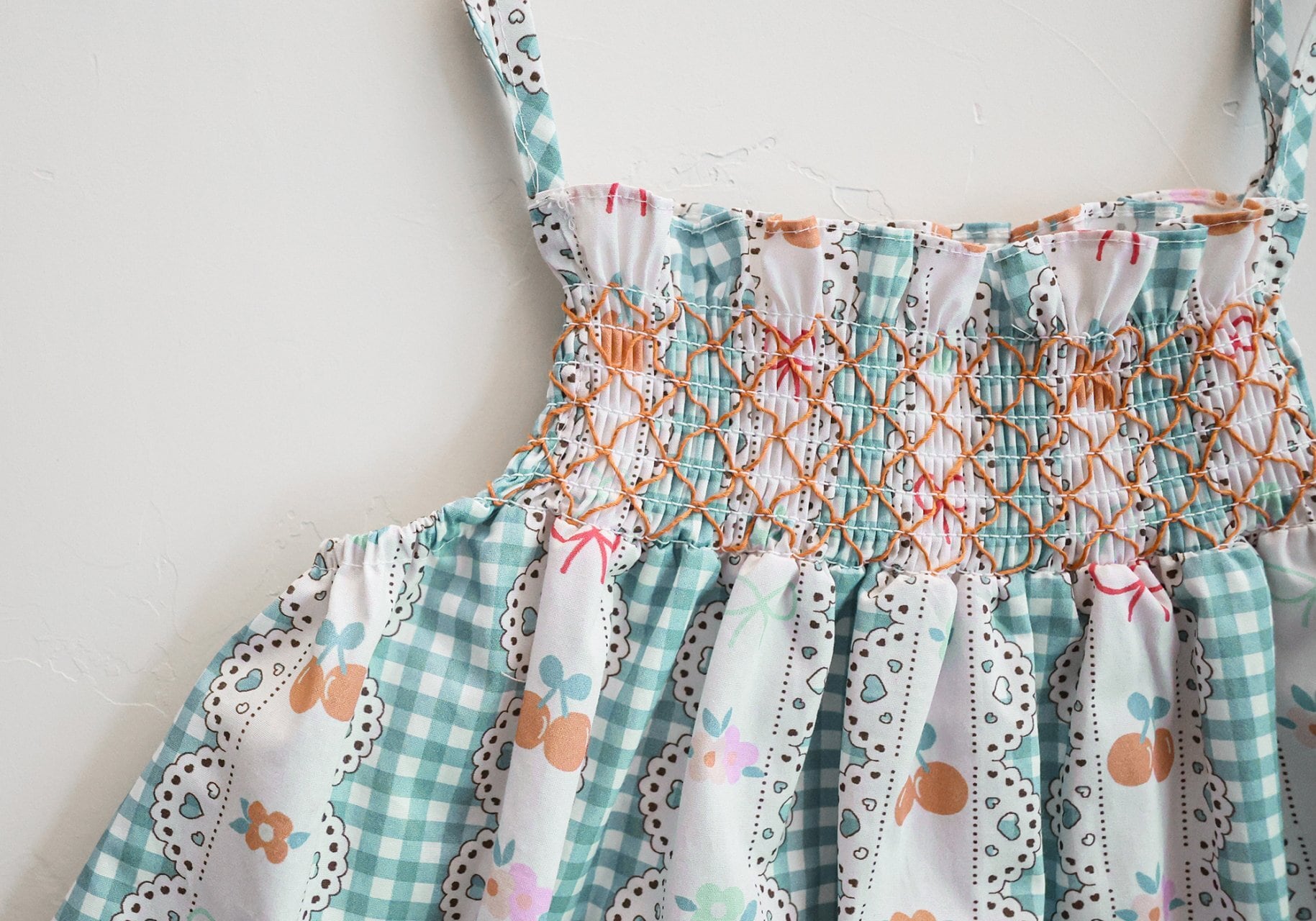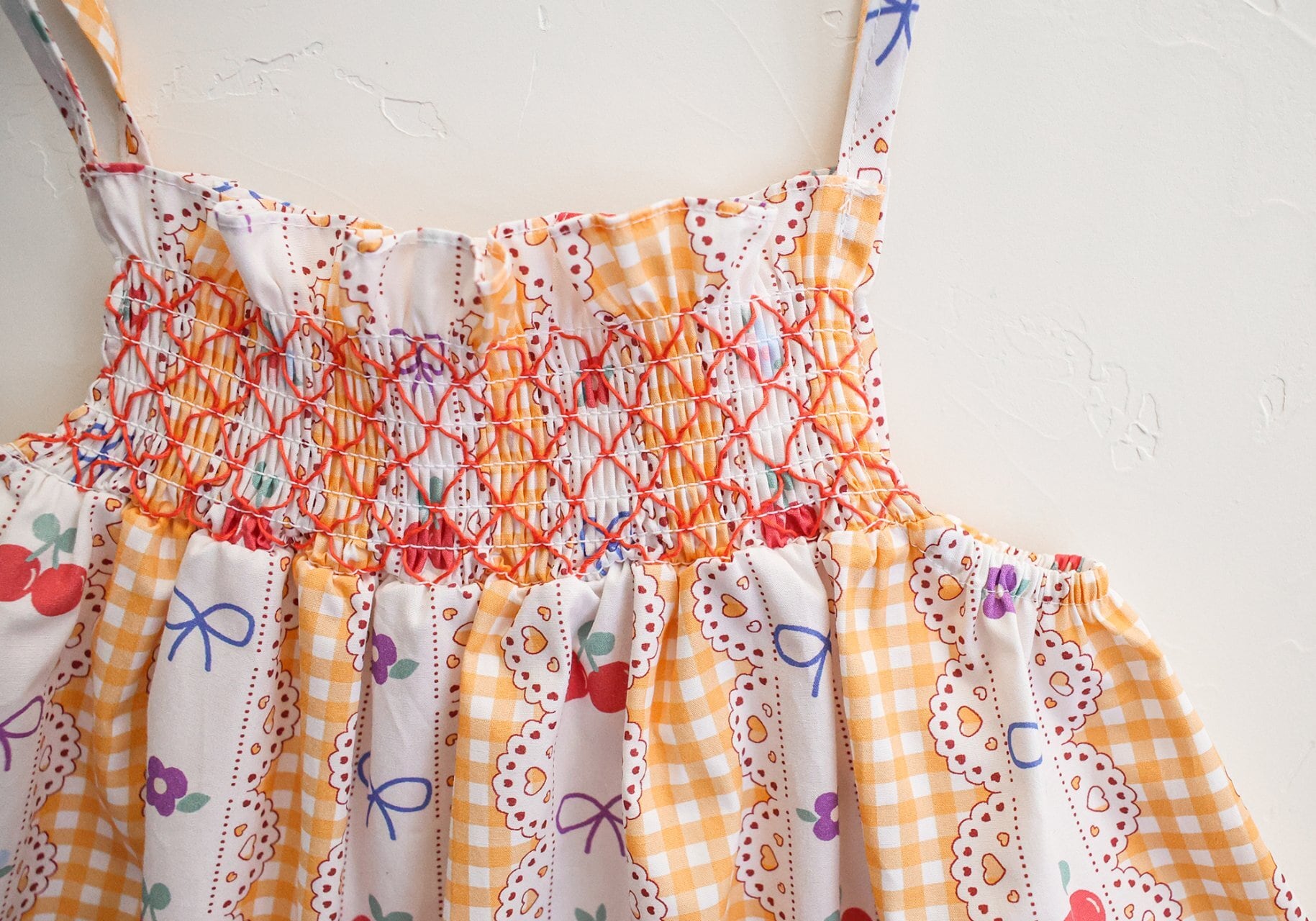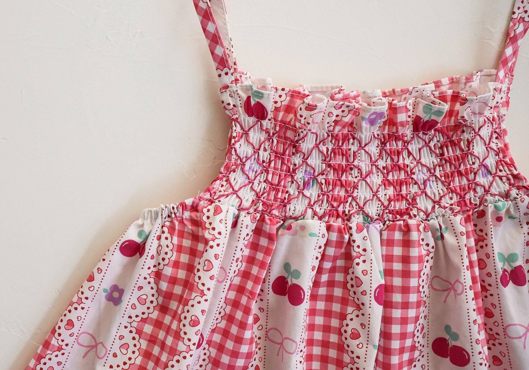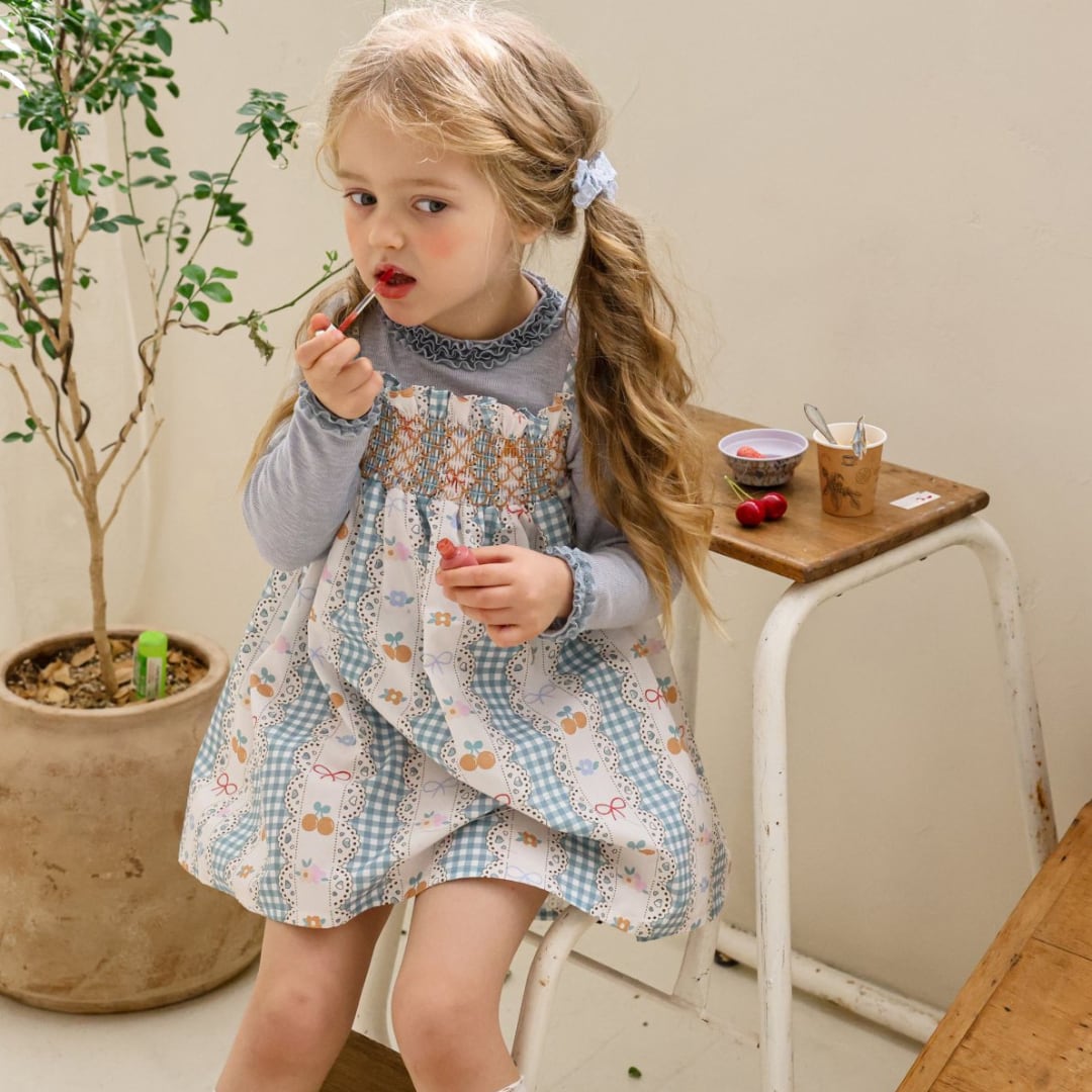 チェリーやリボン、チェック柄を組み合わせた華やかなデザインで