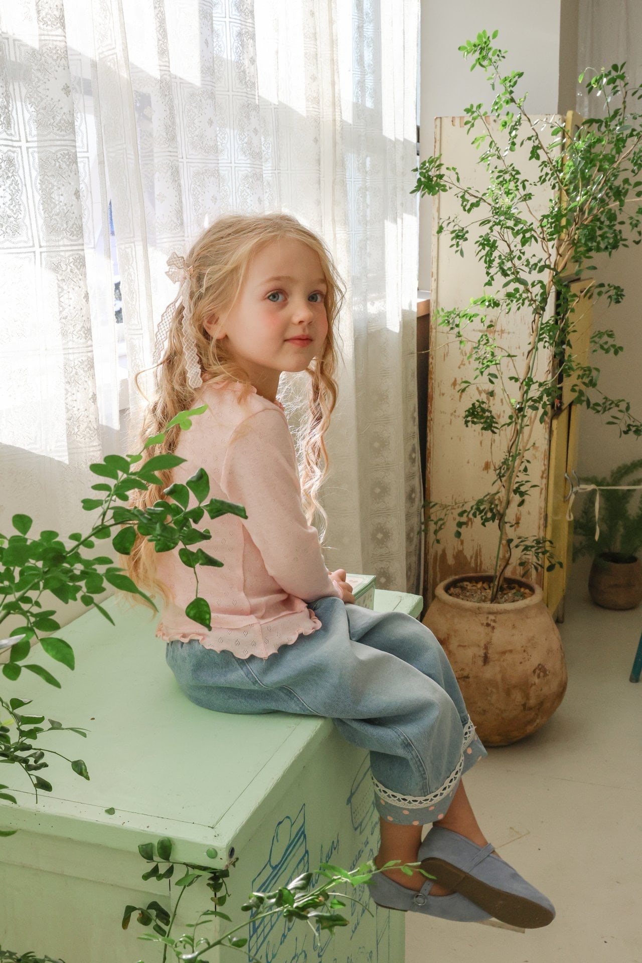 軽やかなハートジャガードとフリルネックで春の明るい印象を演出するTシャツ