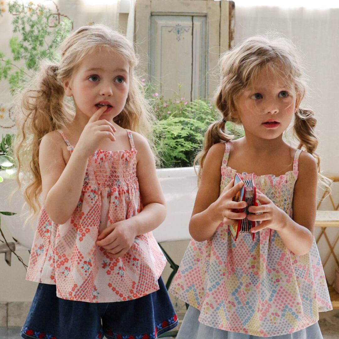 花畑のようなフラワーパターンが魅力のスモッキングノースリーブブラウスです