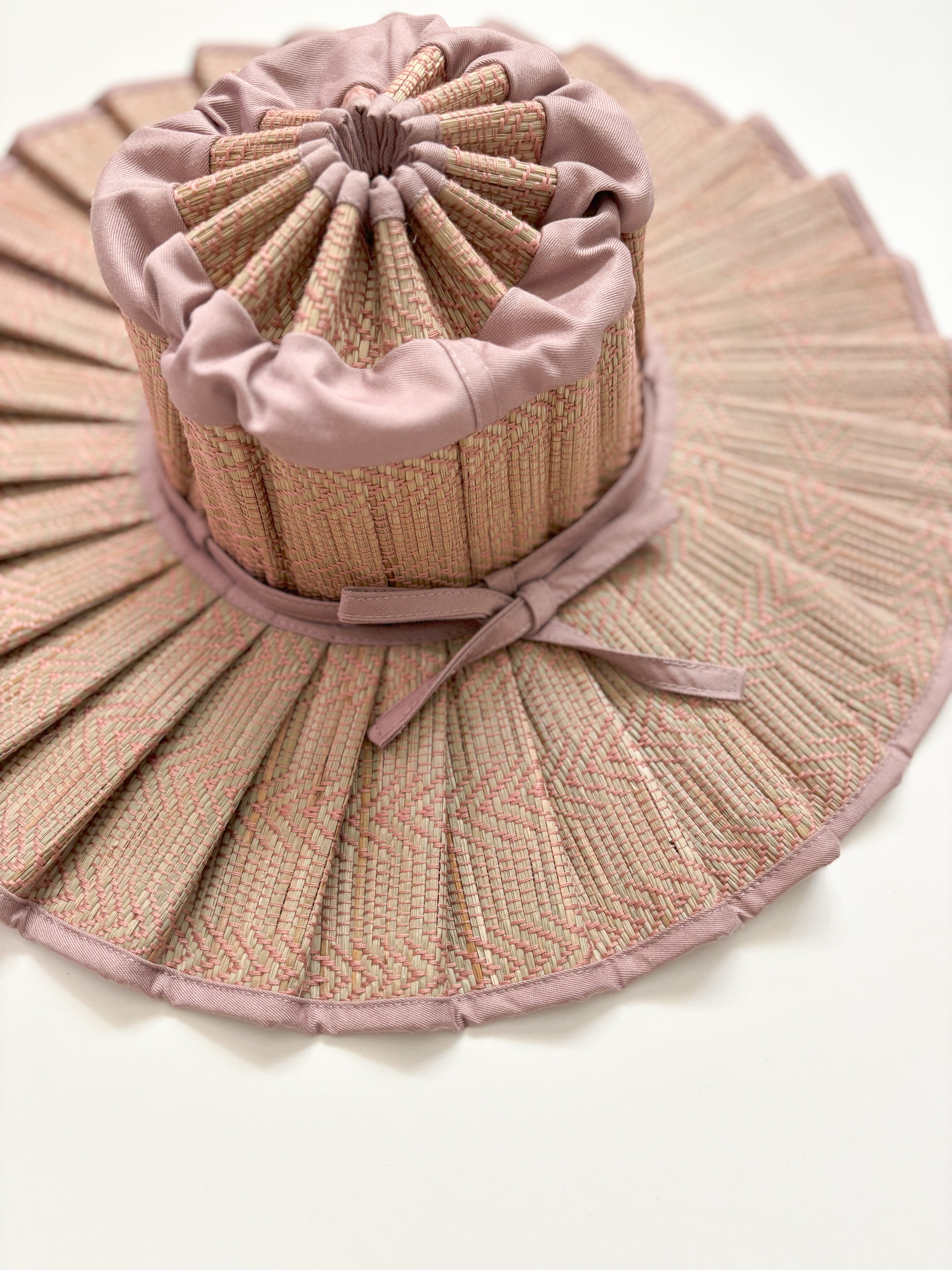 天然草繊維のベースにピーチ ピンク色の糸で交互に斜めの幾何学模様に織り込まれています